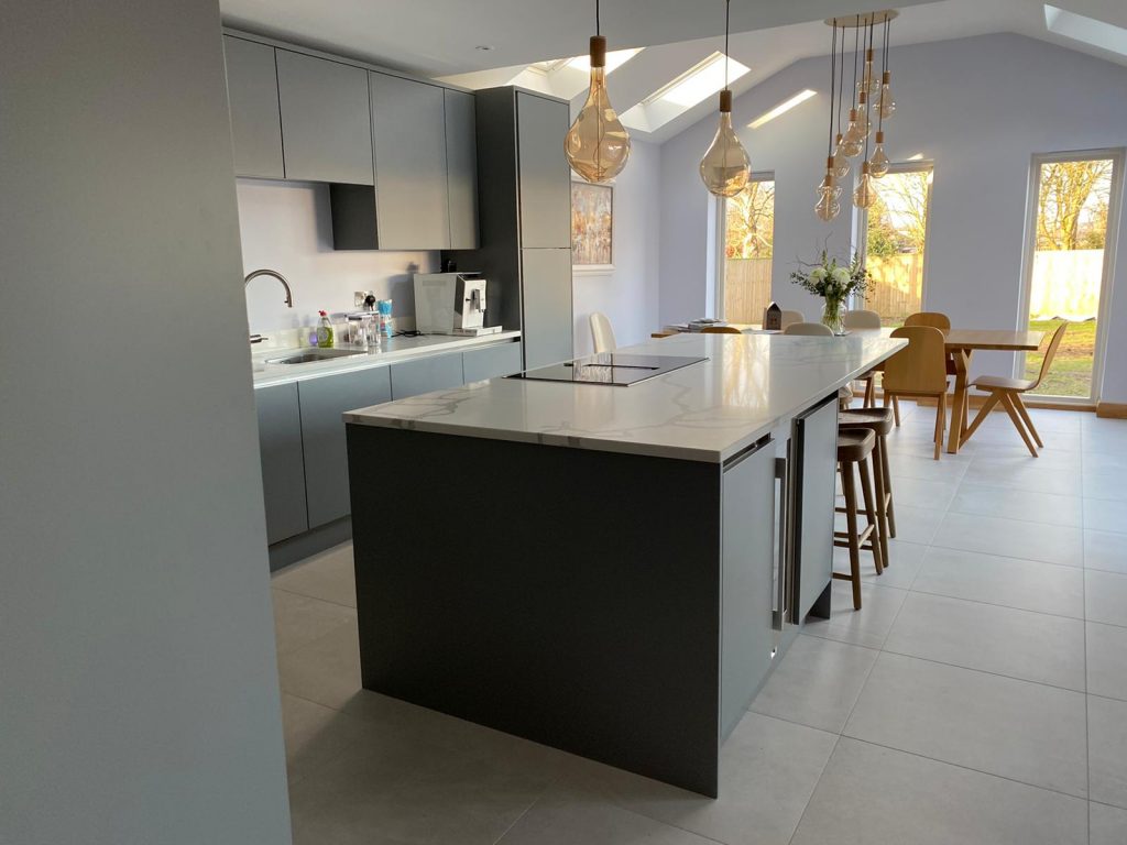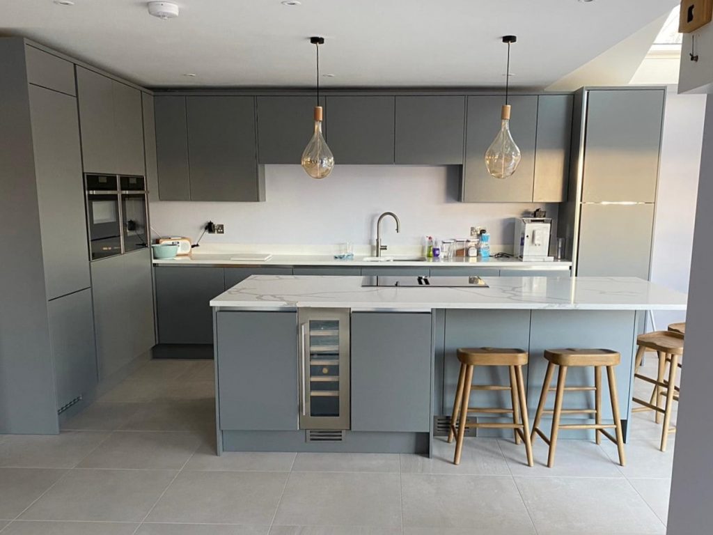 We fitted a bespoke hand-made In-Frame Kitchen in two complimentary colours, including tall ceiling height glass display cupboards, ceiling height counter top cupboards, together with Quartz worksurfaces with bespoke Kingston edge profile and a number of high spec appliances including an Ilve Range Cooker, wine cooler, waste disposal unit and state of the art tap.